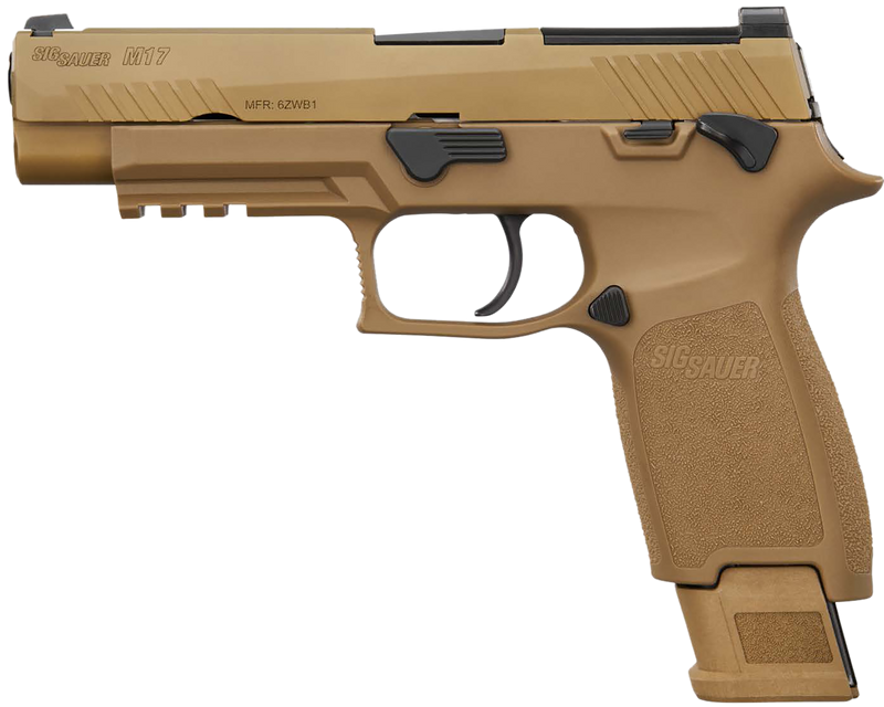 The Sig Sauer M17 is a 9mm Luger striker-fired semi-automatic pistol with a 4.7" barrel and 10+1 round capacity. This full-size, optics-ready platform features SIGLITE night sights, manual safety, a modular polymer frame, and comes with three 10-round magazines. Finished in Coyote Tan PVD with stainless steel slide, it weighs 30.5 oz and measures 8" overall length.
