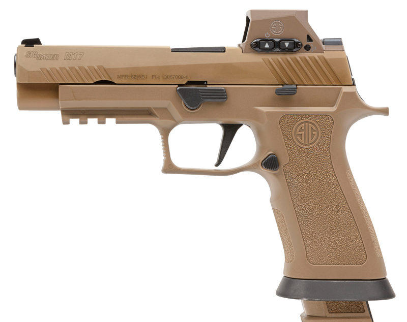 The Sig Sauer M17X is a full-size, striker-fired semi-automatic pistol chambered in 9mm Luger with a 4.7" barrel and 21+1 round capacity. Features an optic-ready Coyote PVD serrated stainless steel slide, polymer frame with beavertail and Picatinny rail, SigLite night sights, and factory-mounted Sig ROMEOM17 red dot optic. Includes three 21-round magazines and weighs 33 oz.