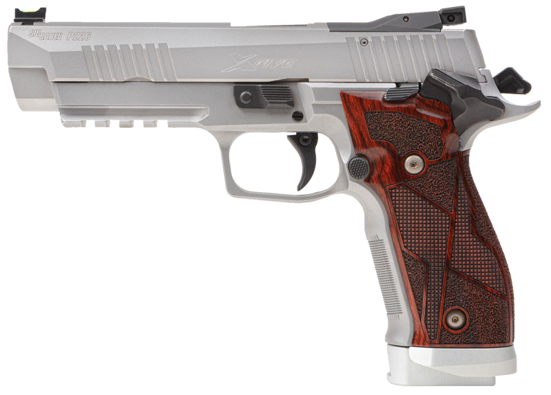 The Sig Sauer P226 X-Five Classic is a single-action semi-automatic pistol chambered in 9mm Luger with a 5-inch bull barrel and optic-ready slide. It features a fully adjustable AX3 trigger system, fiber optic front sight with adjustable rear sight, stainless steel frame with 1913 accessory rail, and custom Hogue Cocobolo grips with alloy magwell. Includes three 20-round magazines and weighs 45.6 oz.