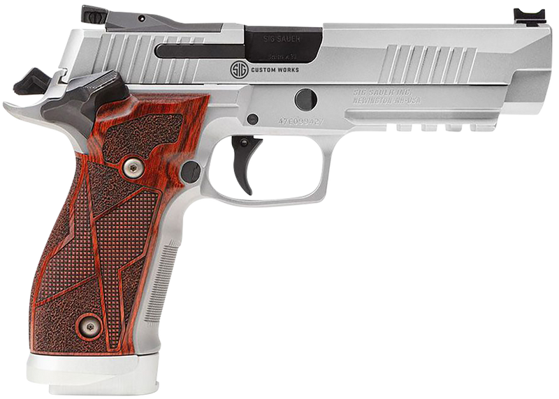 The Sig Sauer P226 X-Five Classic is a 9mm single-action-only semi-automatic pistol featuring a 5-inch bull barrel, stainless steel frame, and optic-ready slide with fiber optic front and adjustable rear sights. It includes custom Hogue Cocobolo grips, a fully adjustable AX3 trigger system, Picatinny rail, and comes with three 10-round magazines. Weighs 45.6 oz with an overall length of 8.6 inches.