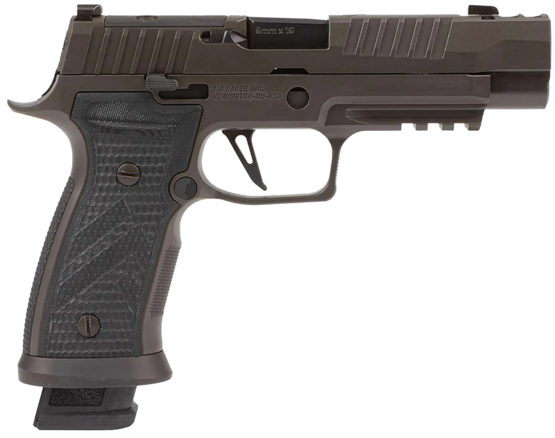 Semi-automatic striker-fired pistol chambered in 9mm Luger with a 3.9" optic-ready ported slide and patented slide-integrated expansion chamber for recoil reduction. Features an all-metal AXG grip module, custom Hogue G10 grips, X-Series flat skeletonized trigger, and XRay Day/Night sights. Includes three 10-round magazines and weighs 36.1 oz.