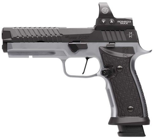 The Sig Sauer P320 MAX 2.0 is a 9mm Luger semi-automatic striker-fired pistol featuring a 5" bull barrel and optic-ready slide designed for competition shooting. It includes a TXG tungsten-infused XFULL grip module with flat skeletonized trigger, custom wrap-around serrations, Romeo3X 6MOA optic, flared magwell, and comes with 4 magazines for a 10-round capacity. Dimensions are 13.6" length x 5.59" height x 1.0" width with an ambidextrous safety.