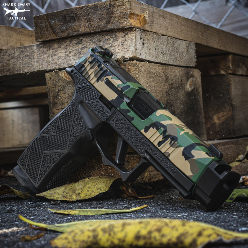 Semi-auto striker-fired compact pistol chambered in 9mm Luger with a 3.7" barrel and 17-round capacity. Features a custom Multicam slide, Zaffiri Precision compensator, and X-Ray3 day/night sights. Includes three 17-round magazines and measures 6.6" overall length with RMR/C optic mounting capability.