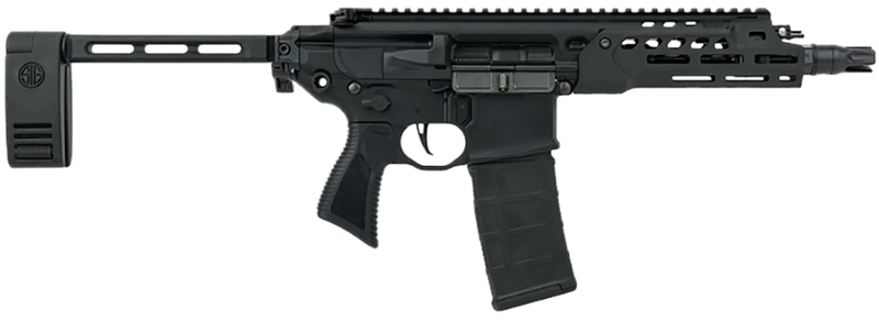 Semi-automatic AR pistol chambered in 5.56 NATO with a 7.75" cold hammer-forged threaded barrel and 30+1 round capacity. Features fully ambidextrous controls, adjustable gas piston for suppressed/unsuppressed use, SIG QD suppressor-ready flash hider, M-Lok handguard, and folding pistol brace. Includes Picatinny rail receiver, flat-blade trigger, and weighs approximately 5.5-6.1 lbs.