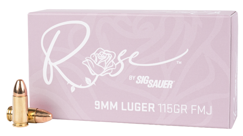 Sig Sauer Rose 9mm Luger ammunition features 115-grain full metal jacket bullets optimized for short-barrel pistols, delivering 1050 fps muzzle velocity and 282 ft-lbs of energy from a 3.1" barrel. This brass-cased, boxer-primed ammunition is designed for reduced felt recoil and reliable performance in lightweight, short-barreled handguns. Each box contains 50 rounds and is sold in cases of 20 boxes.