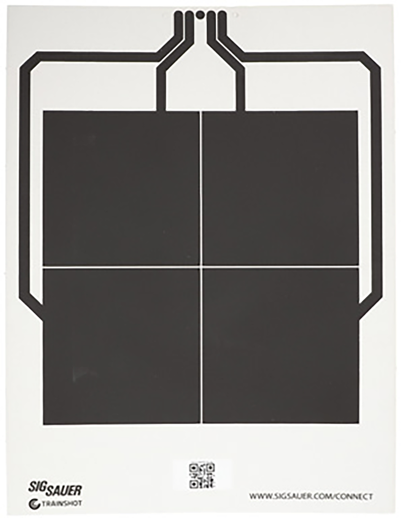 This Sig Sauer replacement target features a 4-square design with black and white coloring for clear sight picture and scoring. The hanging mount style makes it suitable for range use with dimensions of 23.4" length × 17.6" width × 1.3" depth. Compatible with Sig Sauer T300 target systems.