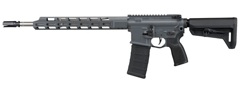 Semi-automatic AR-platform rifle chambered in 5.56 NATO with a 16" stainless steel barrel and 1:8 twist rate. Features a SIG 3-prong flash hider, mid-length direct impingement gas system, SIG Matchlite 2-stage trigger, Magpul SL-K stock, and free-float M-LOK handguard. Optics-ready with threaded barrel, weighs 6.5 lbs, and includes one 30-round magazine.