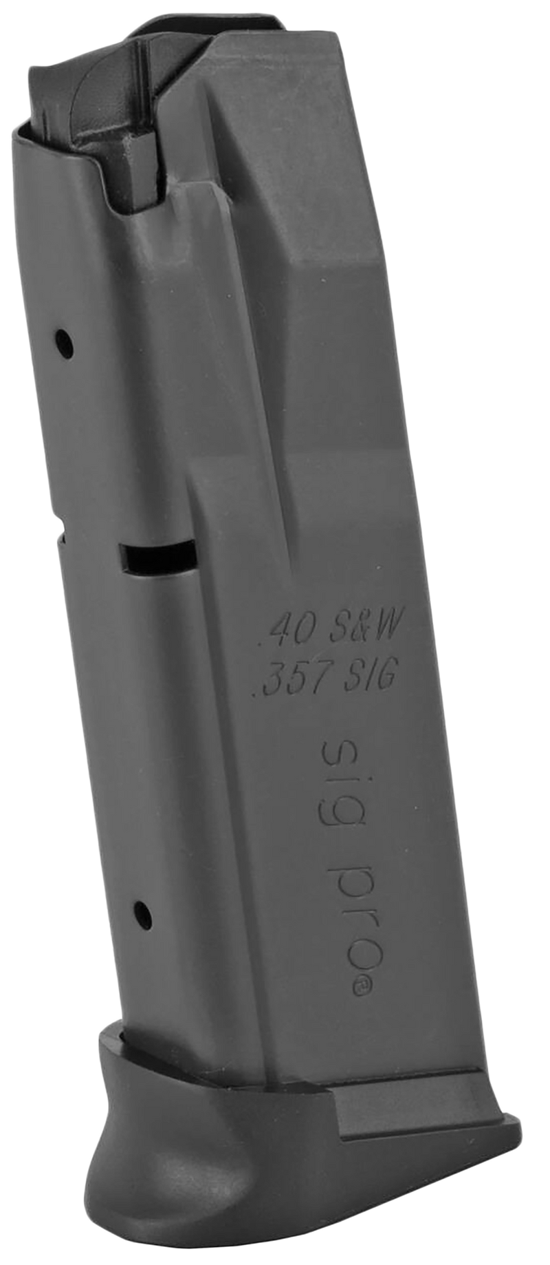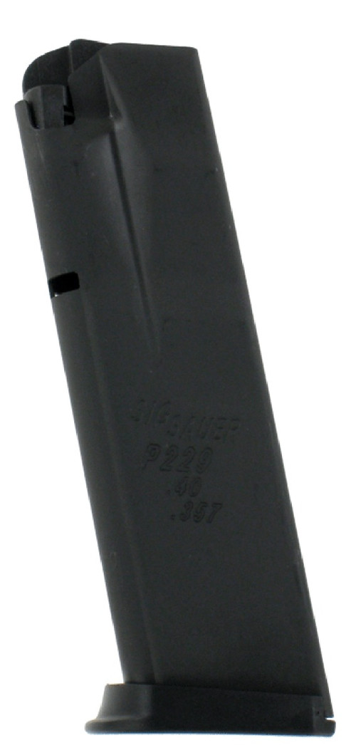12-round detachable magazine chambered in .40 S&W and .357 Sig for Sig Sauer SP2022, SP2340, and SP2009 pistols. Features blued or black steel construction with reliable feeding and retention. Dimensions approximately 9.5" length x 4.0" width x 1.8" height.