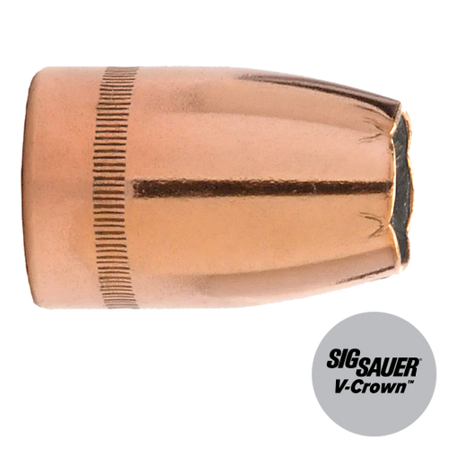 Sierra Bullets V-Crown jacketed lead hollow point bullets designed in partnership with SIG Sauer for optimal weight retention and expansion across effective distances. These 90 grain, .355" diameter bullets feature a stacked hollow point cavity design and are packaged at 100 rounds per box. Includes California Prop 65 warning.