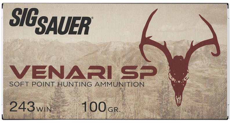 Sig Sauer Venari ammunition in 243 Winchester with 100-grain soft point bullets designed for hunting applications. This centerfire rifle ammo delivers 2960 fps muzzle velocity and 1945 ft-lbs of energy, loaded in brass cases with 20 rounds per box (10 boxes per case).