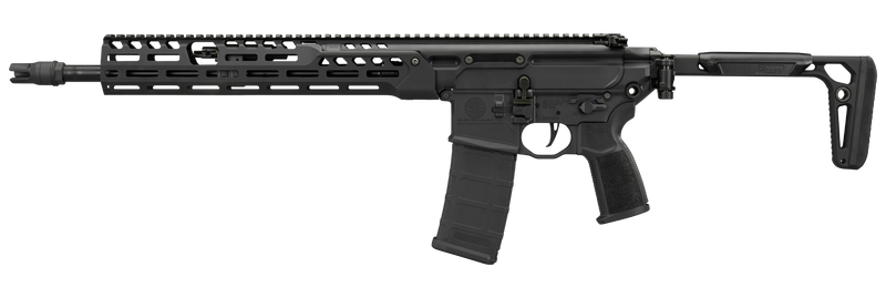 Semi-automatic rifle chambered in 5.56 NATO with a 16" cold hammer forged carbon steel barrel and 30-round capacity. Features a side-folding minimalist stock, fully ambidextrous controls, 13" M-LOK handguard, flat blade match trigger, and optic-ready receiver. Includes one 30-round magazine and suppressor-ready QD flash hider.