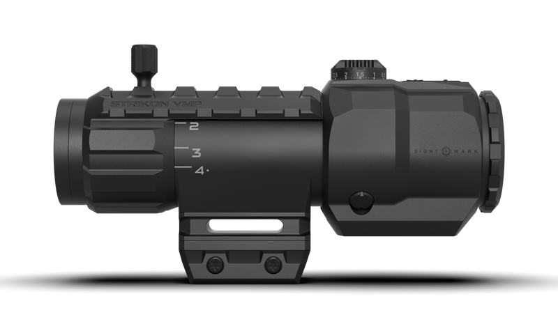 The Sightmark Strikon VMP is a 1-4x22mm second focal plane riflescope with an illuminated reticle designed for rapid target acquisition on modern sporting rifles. Features a prismatic design for a compact profile, bright image, and edge-to-edge clarity with unlimited eye relief and low-profile exposed turrets. Waterproof (IP67), fogproof, and shockproof with 1/10 MIL incremental adjustments and 100-yard parallax adjustment.