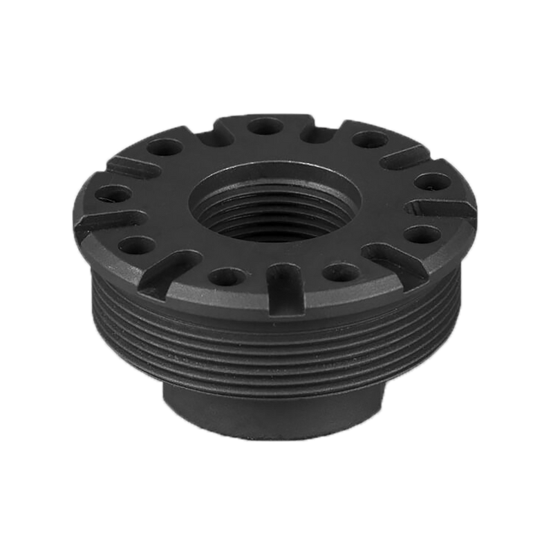 The SilencerCo Bravo Direct Thread Mount is a silencer accessory designed for direct thread attachment to barrels with 9/16"x24 threading. This matte black finished mount measures 6.6" in length and 5.4" in width, providing a secure interface for big bore suppressor applications.
