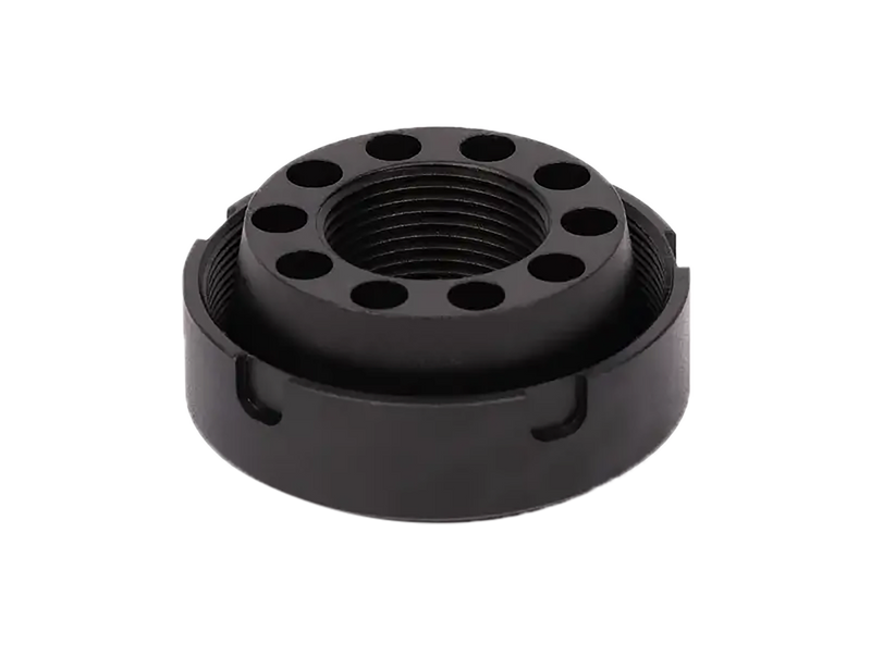 The SilencerCo Charlie Direct Thread Mount is a stainless steel silencer accessory designed for direct thread installation on barrels with 11/16"x24 thread pitch. This oxide black finished mount measures 6.5" in length and 4.5" in width, providing a secure connection for compatible suppressors.