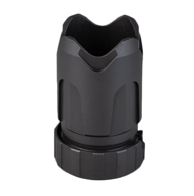 The SilencerCo ASR Blast Shield is a muzzle blast diverter that attaches to any ASR-compatible muzzle device. It reduces muzzle blast and concussion without requiring a separate mount to the firearm. The device measures approximately 4.1" wide by 1.8" tall and is constructed of black steel.