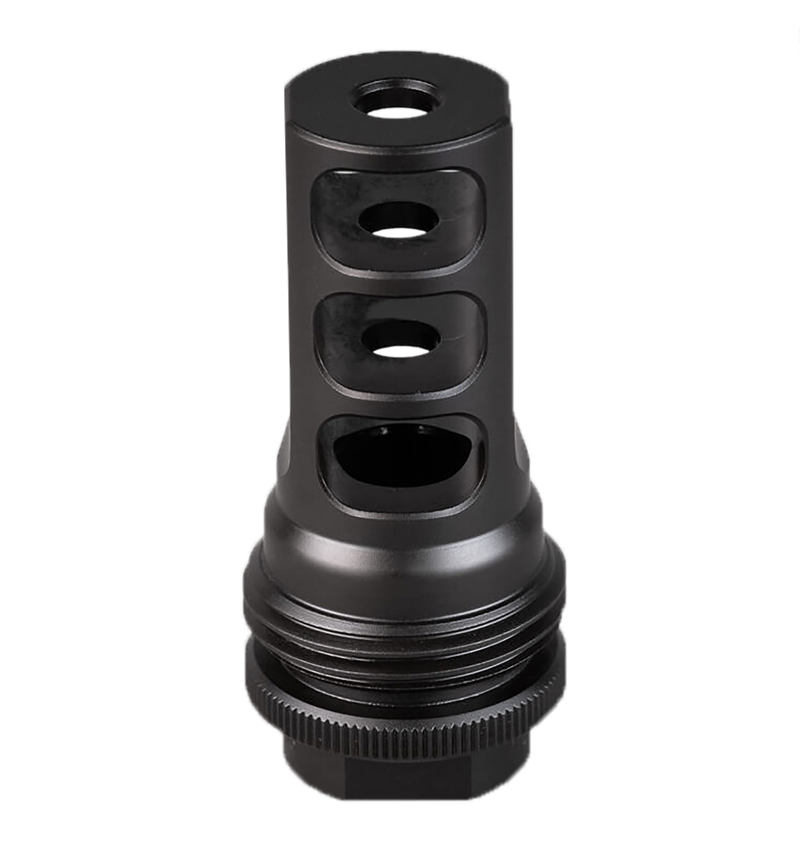 This 3-port muzzle brake is compatible with all SilencerCo ASR mounting systems and offers one-hand-on, one-hand-off attachment and detachment. The design effectively reduces felt recoil and muzzle climb while featuring patent-pending resonance suppression technology. Comes with shim set and rocksett for installation.