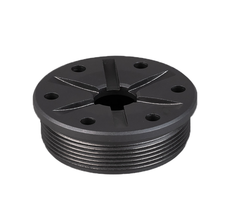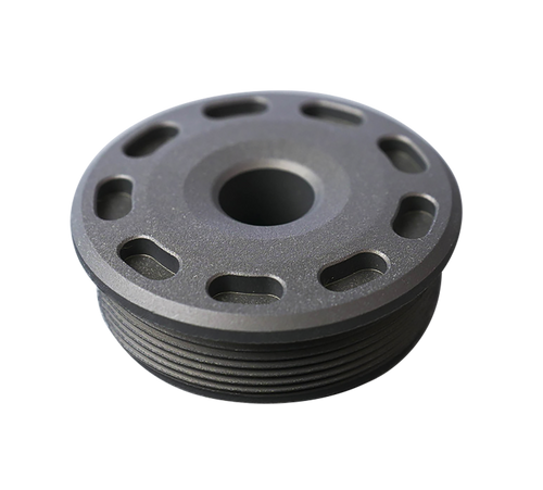The Bravo Front Cap is a suppressor accessory compatible with SilencerCo Omega 300 and Hybrid 46 silencers. This flat front end cap reduces overall length from 7.09" to 6.06" (on Omega 300 with Direct Thread Mount) and decreases sound signature by 2-5 dB compared to the standard Anchor Brake configuration.