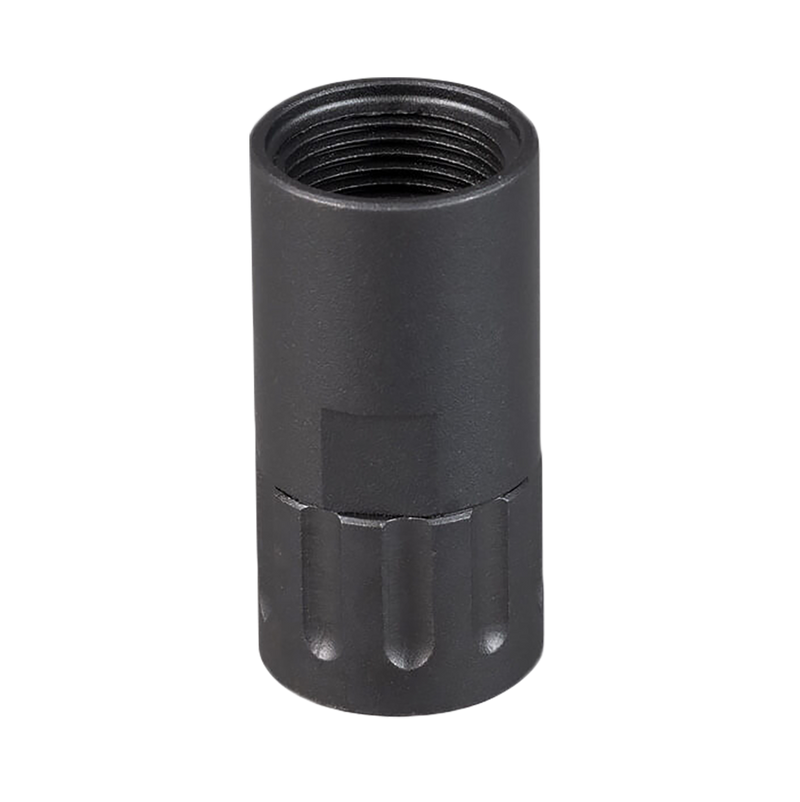 This is a muzzle adapter for rimfire suppressors that converts 1/2x28 threads to 1/2x28 threads while shortening the thread engagement from 0.6" to 0.4". The adapter features o-ring engagement to keep muzzle threads clean and prevent suppressor loosening during firing. Compatible with SilencerCo 22 caliber suppressors including Switchback 22, Sparrow 22, Spectre 22, Warlock 22, and Osprey Micro 22.