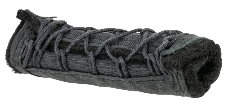 This is a suppressor cover accessory made from Kevlar and Nomex material, designed for extreme temperature resistance up to 2500 degrees Fahrenheit. The 6" cover features cinch-style cording to keep it securely in place during shooting. Compatible with SilencerCo suppressors, it provides protection and reliability in any environmental condition.