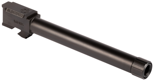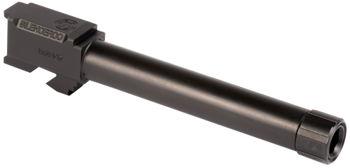 Replacement threaded barrel for Glock 43 9mm pistols featuring a 1/2x28 RH thread pattern and 3.7" length. Constructed from 416R stainless steel with black nitride finish, this barrel is designed for use with suppressors and includes a 1:10" rate of twist. Note: SilencerCo piston not included.