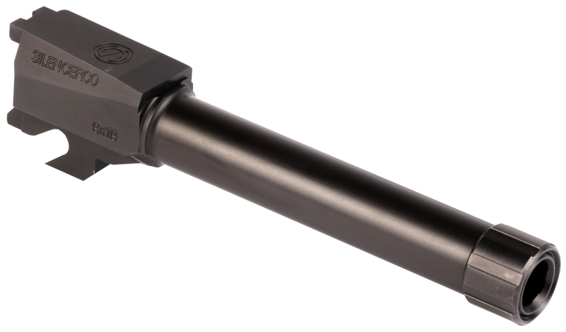 This is a threaded pistol barrel designed for the Sig Sauer P320 Compact chambered in 9mm Luger with a 1/2x28 thread pitch. Constructed from 416R stainless steel and finished in black nitride, it is compatible with SilencerCo suppressors and other threaded silencers when paired with the appropriate piston.