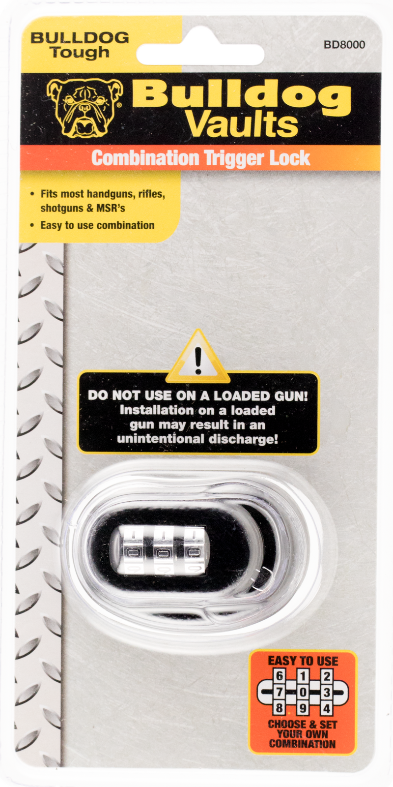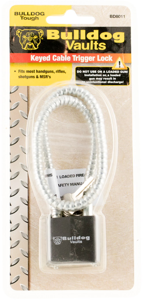The Bulldog BD8000 is a trigger guard-mounted gun lock that secures most handguns, rifles, and shotguns with a combination locking mechanism. Constructed from black metal, this safety device prevents unauthorized access and use. California Prop 65 approved.