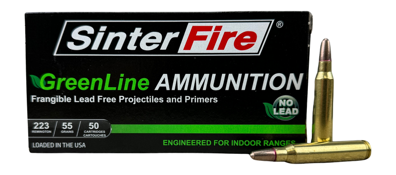 Sinterfire 223 Remington ammunition loaded with 55-grain lead-free projectiles in a 50-round box. This ammunition is designed for centerfire rifle use and meets lead-free shooting requirements for indoor ranges and environmentally conscious shooters.