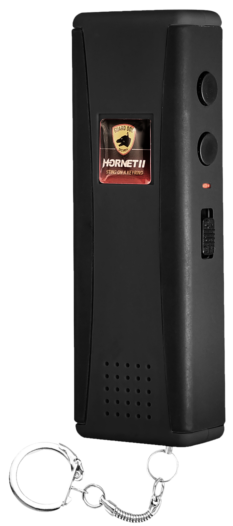 The Hornet 2 is a compact stun gun featuring an integrated flashlight and 120dB alarm for personal protection. It includes a keychain attachment, siren alarm function, and comes with a USB charger for convenient recharging. Weighing 2.10 oz with dimensions of 6.9" x 5.8" x 1.3", it is designed for portable self-defense applications.
