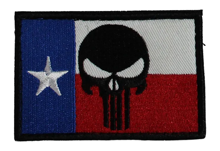 Morale patch featuring Texas flag design with Punisher skull graphic. Measures 3.5" x 2.8" with 0.5" thickness. Suitable for attachment to tactical gear, bags, or apparel.