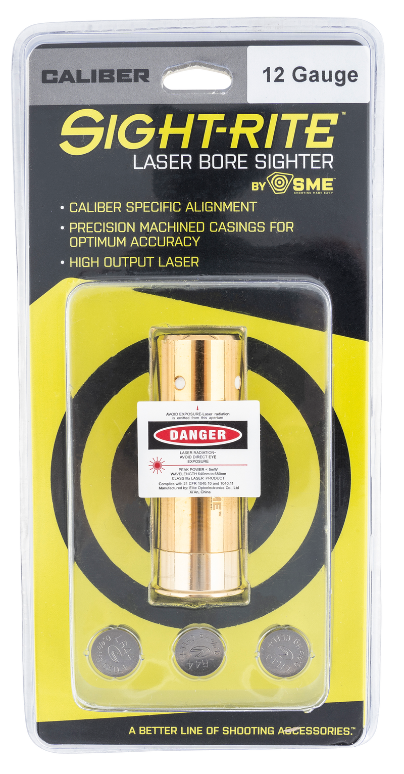 The SME Sight-Rite is a cartridge-style laser bore sighter designed for 12 gauge shotguns and compatible with calibers from .17 to .50. It features a red laser that projects a visible sighting point for quick barrel alignment. The kit includes a calibration target and carrying tube for convenient transport and storage.
