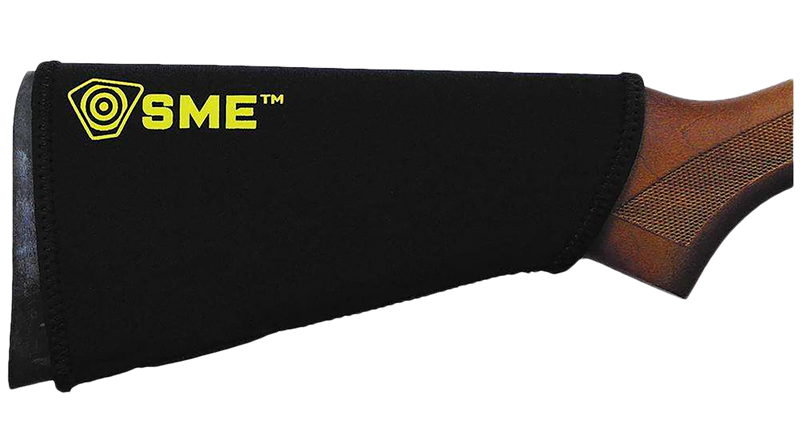 This neoprene rifle stock riser improves shooting comfort and eye alignment by adjusting cheek height. It features 100% neoprene construction with a rubber backing and includes 5 foam inserts in varying thicknesses (1/8", 1/4", 3/8", 1/2", 5/8") for customizable fit. Built-in swivel stud access allows sling attachment without modification.
