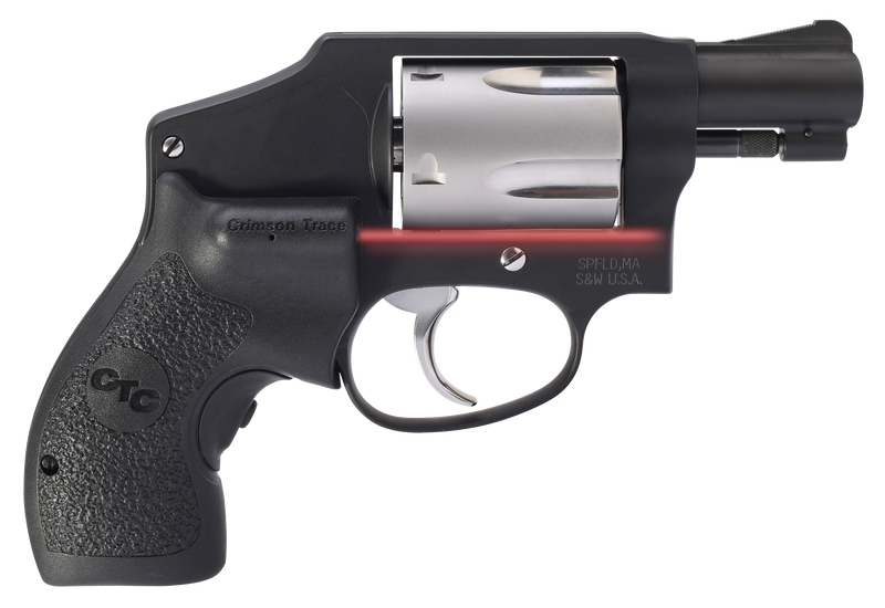 Double-action-only revolver chambered in .38 S&W Special +P with a 1.88" black stainless steel barrel and 5-round capacity. Features a concealed hammer, J-frame design, and includes Crimson Trace LG-105 red lasergrips for target acquisition. Weighs 15 oz with an overall length of 6.31", designed for concealed carry.