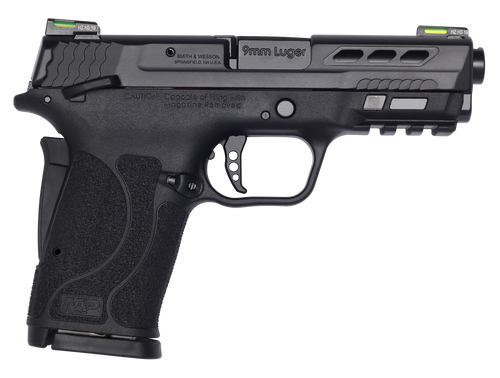 The Smith & Wesson M&P Shield is a striker-fired 9mm Luger semi-automatic handgun with a 3.10" barrel and 7+1/8+1 round capacity. Features a Cerakote serrated aluminum slide, black Armornite stainless steel barrel, matte black polymer frame with thumb safety, and 3-dot white contrast sights. Weighs 20.80 oz with dimensions of 12.2" length x 6.9" width x 2.5" height, designed as a micro-compact carry pistol.