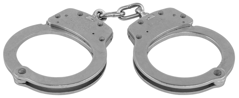 Stainless steel handcuffs with push pin mechanism for quick release. Adjustable size fits various wrist dimensions. Designed for restraint and detention purposes.