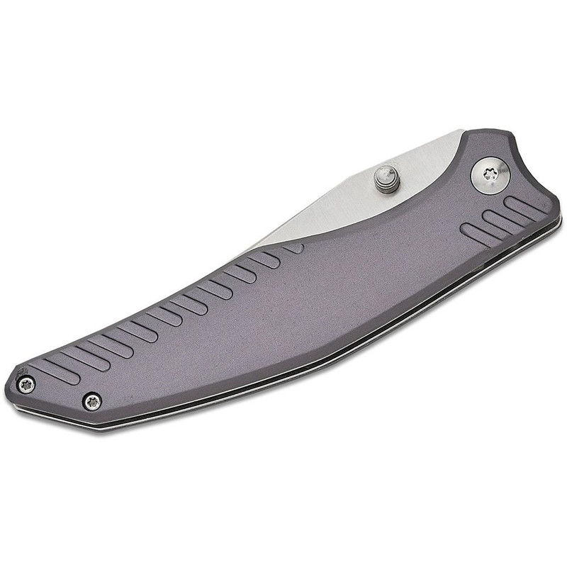 This compact folding knife features a 3.35-inch 3Cr stainless steel clip point blade with a satin finish and plain edge, paired with a durable grey aluminum handle. It includes dual thumb studs for easy one-handed opening, a liner lock for secure blade retention, and a tip-up pocket clip for everyday carry. Overall length is 7-7/8" and it weighs 3.8 oz.
