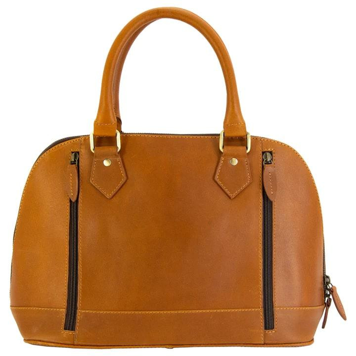 This sophisticated concealed carry satchel features tan-brown cowhide leather with hand-stitched handles and natural trim. A discreet compartment on the backside provides secure storage for a concealed firearm, while a zippered closure with gold trim keeps the interior secure. Designed for everyday carry and commute use.