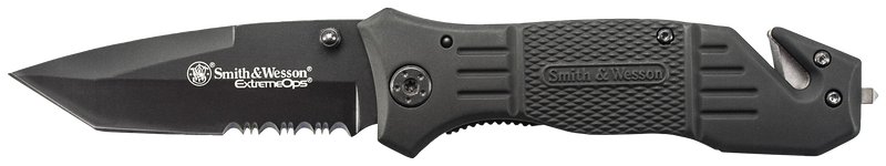 The Smith & Wesson Extreme Ops is a 3.3" tanto blade folding knife with a partially serrated stainless steel edge, designed for tactical and everyday carry use. Features a thumb stud opening mechanism, aluminum handle with pocket clip, and an 8" overall length when open. This knife includes utility features such as a glass breaker and strap cutter for emergency response applications.