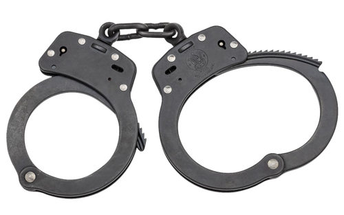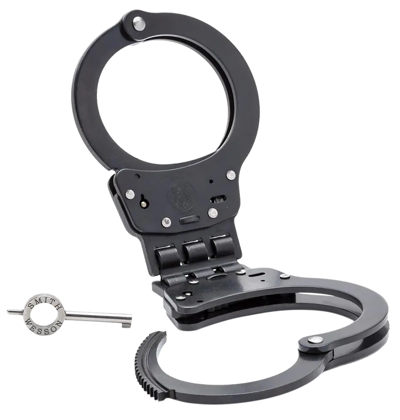 Smith & Wesson hinged handcuffs feature a hinged design to restrict movement and include double lock slot configuration for increased security. Fabricated from heat-treated carbon steel with smooth ratchets for swift cuffing and tamper-resistant double locks. All S&W handcuffs meet or exceed U.S. National Institute of Justice standards for workmanship, strength, corrosion, and tamper resistance.