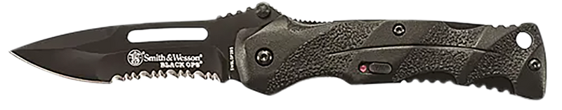 The Smith & Wesson Black Ops is a folding knife featuring a 3.40" drop point blade made from 4034 stainless steel with partial serration for versatile cutting tasks. The knife has an aluminum frame, thumb stud opening mechanism, and includes a pocket clip for convenient carry. Overall length is 7.70" when open, with a weight of 0.26 lbs.
