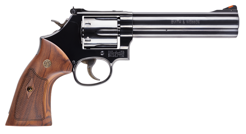 Smith & Wesson Model 586 Classic is a double/single action L-Frame revolver chambered in .357 Magnum and .38 S&W Special +P with a 6" blued carbon steel barrel and 6-round cylinder. Features include adjustable red ramp front and white outline rear sights, wood grips with S&W medallions, square butt frame, and serrated backstrap. This timeless revolver weighs 46.3 oz with an overall length of 11.25" and is designed for personal protection and sport shooting.