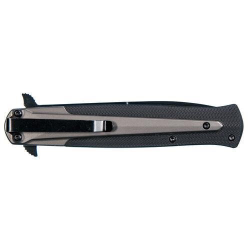 This tactical folding knife features a 3.85" black oxide blade made from 8Cr13MoV stainless steel with a dagger clip point design. The aluminum and nylon handle includes a liner lock mechanism and dual thumbstud opening for secure one-handed deployment. Overall length when open is 8.7 inches, with a weight of 5 oz, making it suitable for everyday carry or tactical applications.