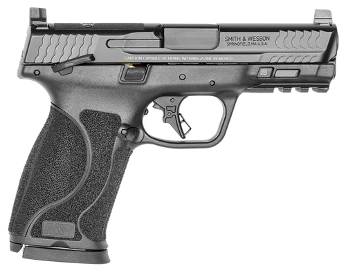 Smith & Wesson M&P M2.0 10mm Auto striker-fired semi-automatic pistol with a 4" barrel and 15+1 round capacity. Features an optics-ready slide with cut for red dot mounting, flat-face trigger for consistent finger placement, textured polymer grip, and thumb safety. Overall length 7.2", weight 27.8 oz, includes 2 magazines.