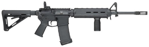Semi-automatic AR-platform rifle chambered in 5.56 NATO with a 16" chrome moly barrel and 30-round magazine capacity. Features Magpul MOE stock and grip, folding rear MBUS sights, and M4 A2 post front sight; includes Picatinny rail for optic mounting and a threaded barrel. Weighs 108.8 oz with an overall length of 37.0" and comes in FDE finish.