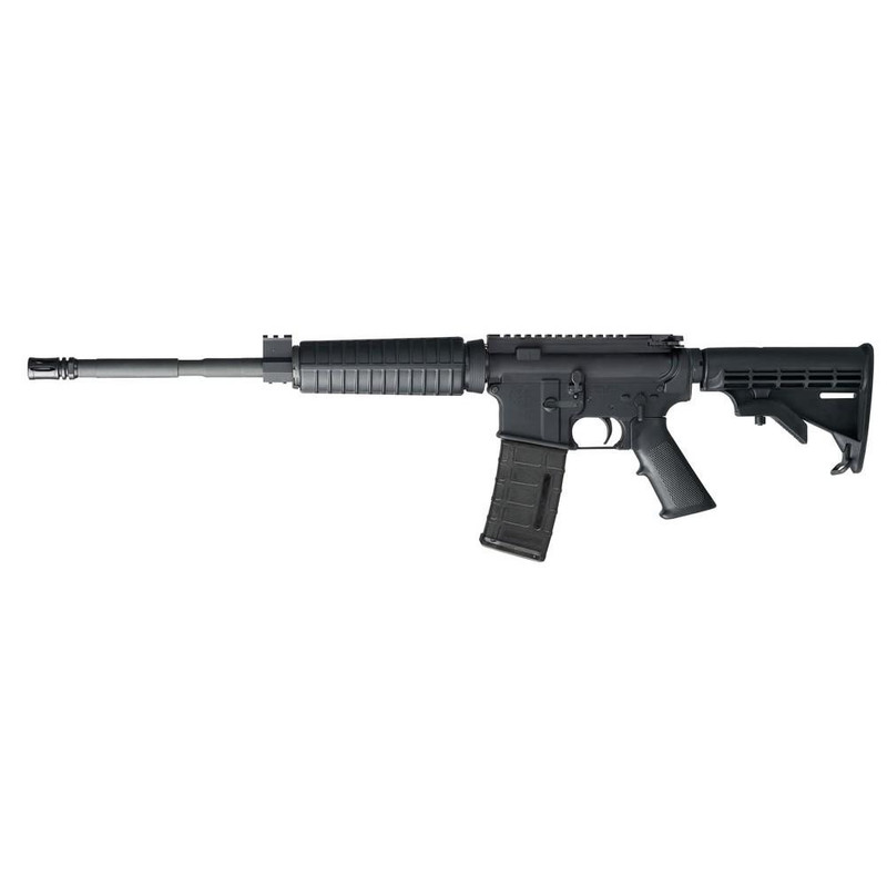 Gas-operated semi-automatic rifle chambered in 5.56 NATO with a 16" barrel and 30-round capacity. Features a 6-position telescopic stock, Picatinny rail system for optics mounting, M4 handguard, and threaded barrel. Weighs 6.07 lbs unloaded with an overall length of 35" extended or 32" compacted.