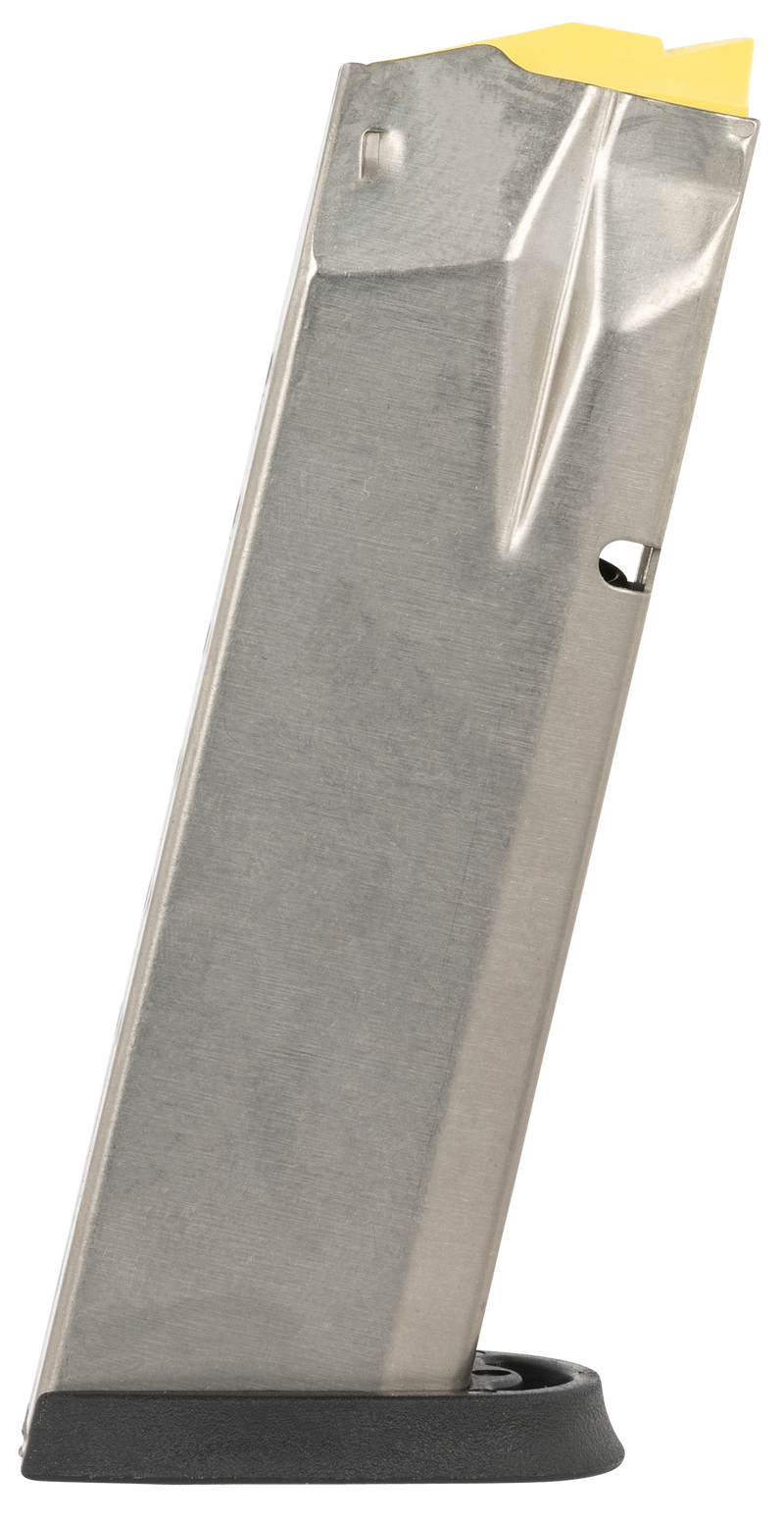 Factory Smith & Wesson handgun magazine chambered in 10mm Auto with 15-round capacity. Features stainless steel construction with gloss black coating, rear witness holes for round count visibility, and a yellow follower for quick identification. Includes standard removable baseplate and fits S&W M&P M2.0 pistols.