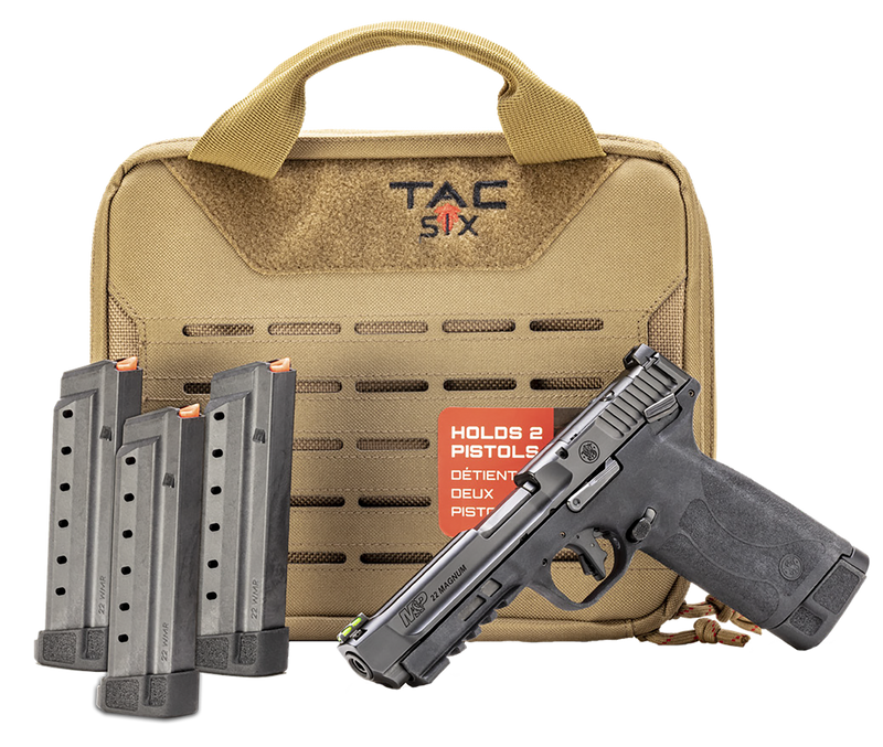 The Smith & Wesson M&P .22 Magnum is a semi-auto pistol chambered in .22 WMR with a 4.35" black Armornite barrel featuring an optic-ready serrated slide. The full-size black polymer frame includes a Picatinny rail, ambidextrous controls, and ships with four 30-round magazines and a tactical pistol case.