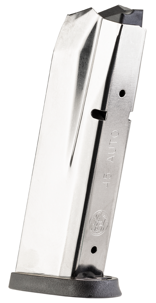 Smith & Wesson replacement magazine for M&P 45 ACP pistols with 10-round capacity. Features a black finish with black base plate and steel construction for reliable performance and durability.