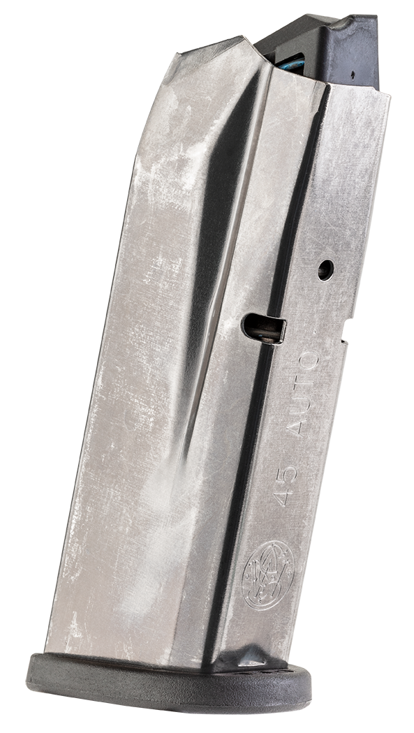 This Smith & Wesson M&P Compact magazine holds 8 rounds of 45 ACP ammunition and features a detachable design compatible with M&P Compact pistols. The magazine measures 7.3" in length with a 2.5" width and includes a black finish with stainless steel construction for durability.