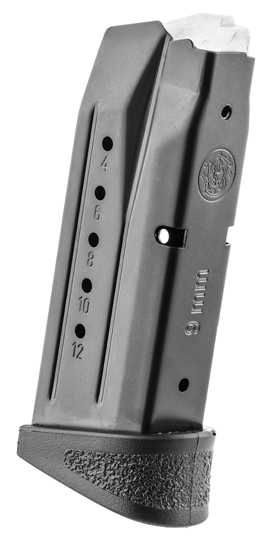 Smith & Wesson M&P Compact magazine chambered in 9mm Luger with 12-round capacity. Features blued steel construction and finger rest for improved handling and control.