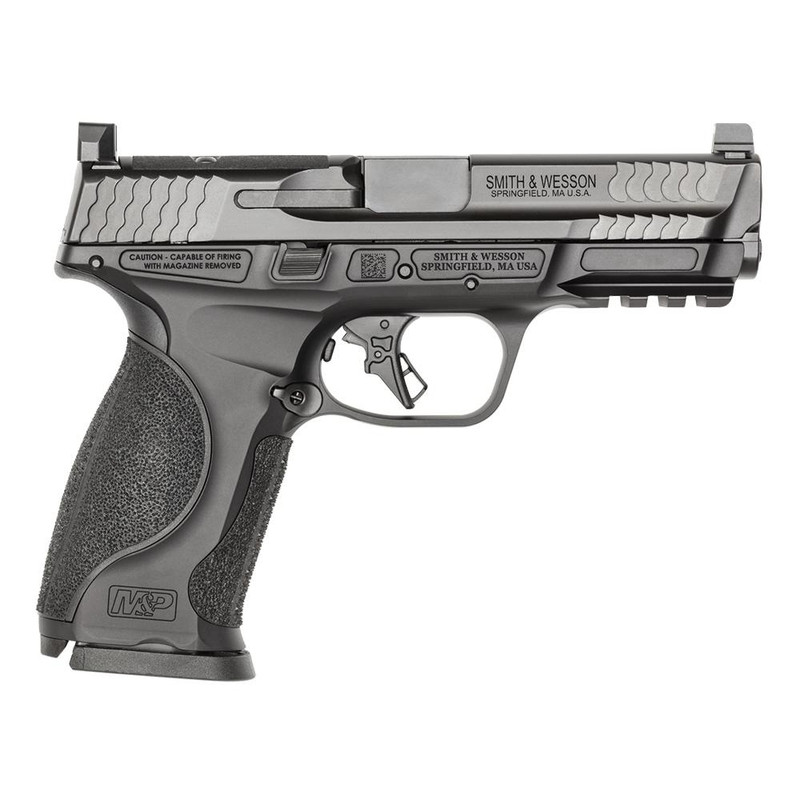 Semi-auto handgun chambered in 9mm Luger with a 4.25" barrel and 17-round magazine capacity. Features optic-ready slide with adaptor plate, night sights, and an 18-degree grip angle designed for natural point of aim. Built on the M&P platform with compatibility for all M2.0 magazines, slides, and holsters.
